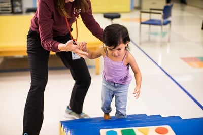 A physical therapist helps a toddler-aged girl climb stairs